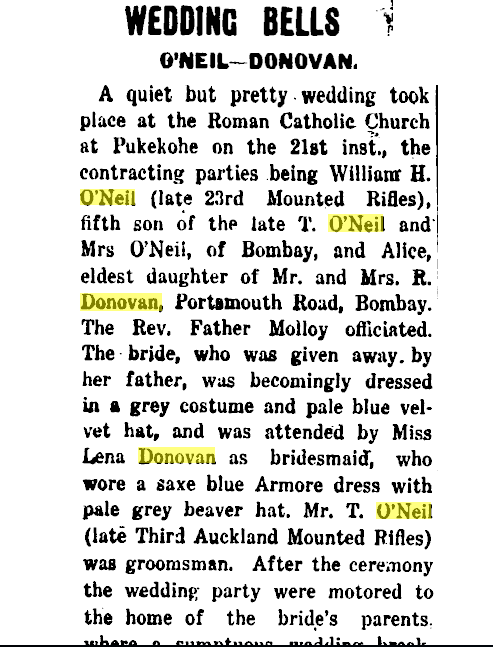 Leonard William O’Neil. Leonard was born on the 21st of January 1875 and served in the Boer War with the New Zealand Mounted Rifles, 6th Contingent (3533). Leonard married Gertrude Holt in 1915.