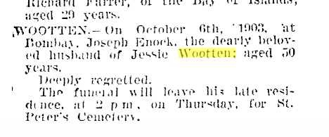 Joseph died on the 6th of October,1903, and Jessie died on the 10th of November,1909, both in Bombay.