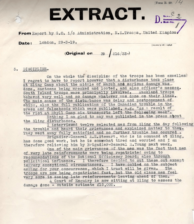Frederick like many of the NZEF were stationed temporarily in Sling Camp in England, the camp just 24 miles from Bromham, where his father was born. Hundreds of NZEF Soldiers rioted in March,1919 causing £15,000 of damage and raiding the stores for alcohol and cigarettes.