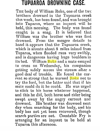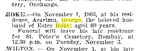 Clara Roke. Clara was born on the 23rd of June,1867 in Ramarama, but died in March,1869.