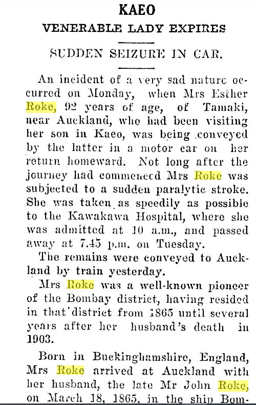 Esther died from a Stroke on the 29th of August,1933 in Kawakawa, New Zealand aged 92. Esther kept her facilities right to the end, and could still remember the hardships of the early days in Bombay.