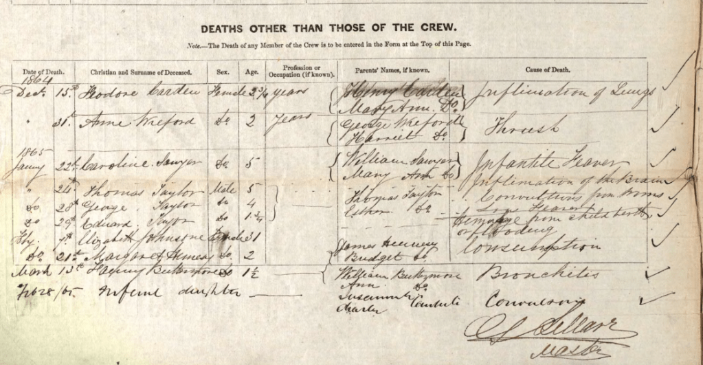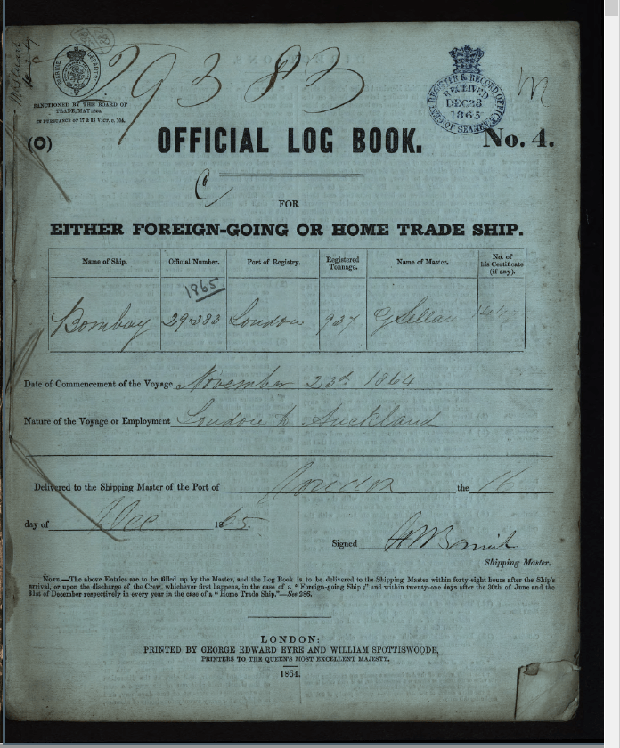 The following chapters are the collected Journals, Newspaper clipping and Official Ships Log of the Bombay’s voyage from London to New Zealand on the 22nd of November 1864 and arriving 18th of March 1865. There is known to be several other journals of the voyage but they remain in private hands, and have not been able to be viewed. The following abbreviations have been used: Also collected is personal recollections of passengers which have been included from other sources.